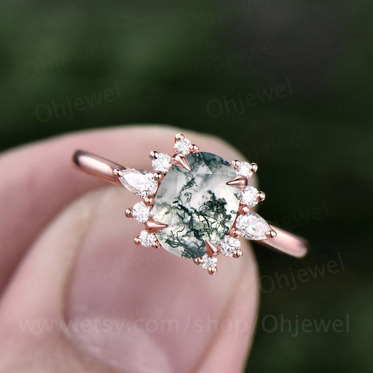Oval cut moss agate engagement ring vintage rose gold green moss ring organic stone 7 stone ring marquise moissanite ring dainty jewelry
