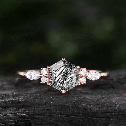 Hexagon black rutilated quartz engagement ring for women vintage art deco moissanite ring rose gold six prong anniversary promise ring gift
