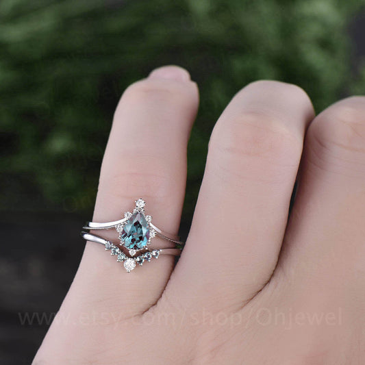 Color change alexandrite ring set 2pcs pear alexandrite engagement ring set white gold unique vintage moissanite ring anniversary gift