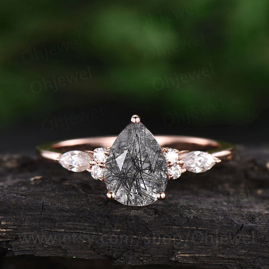 Pear black rutilated quartz engagement ring for women vintage marquise moissanite ring rose gold black stone ring anniversary wedding ring