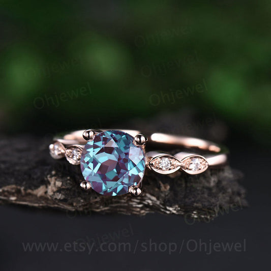 Round cut Alexandrite engagement ring color change Alexandrite ring vintage for women rose gold diamond jewelry bridal anniversary gift