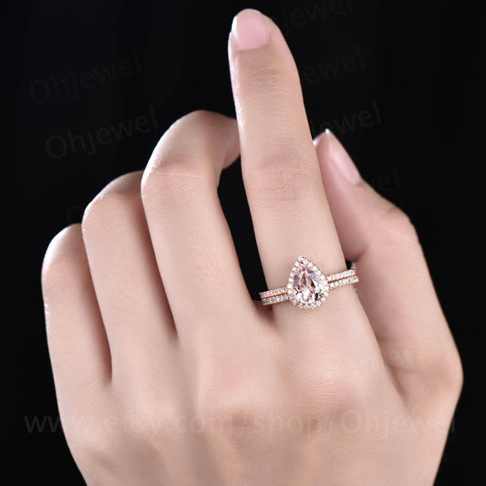 2pcs Pear shaped morganite engagement ring set full eternity diamond ring for women solid 14k rose gold bridal set morganite jewelry gift