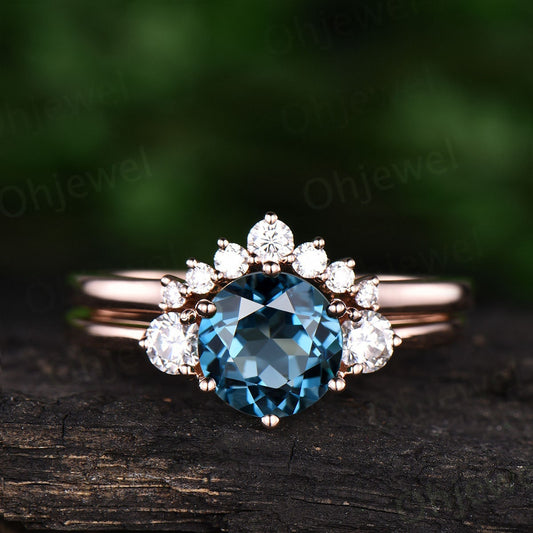Three stone London blue topaz engagement ring set rose gold topaz ring vintage November birthstone moissanite wedding bridal ring set women