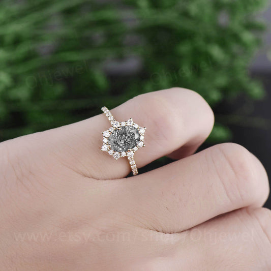 Vintage black rutilated quartz engagement ring moissanite unique best engagement ring rose gold ring for women dainty jewelry promise ring