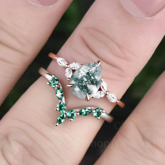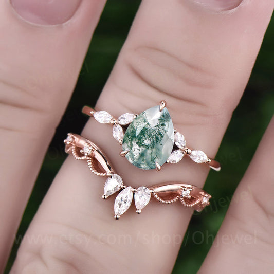 Pear moss agate ring set for women art deco vintage moss agate engagement ring set rose gold silver marquise emerald moissanite ring set