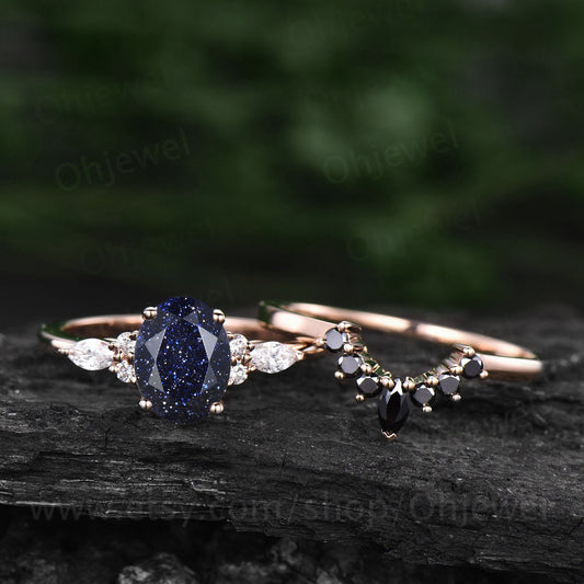 Unique oval cut blue sandstone engagement ring set 14k rose gold black diamond ring set marquise ring set 7 stone ring bridal ring set women