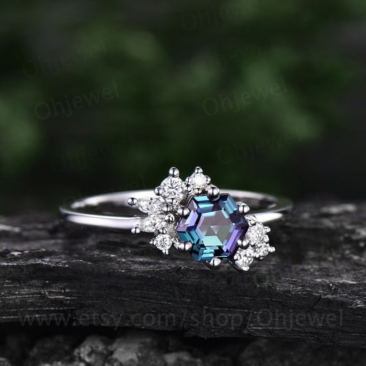 Hexagon cut Alexandrite ring for women vintage unique cluster Alexandrite engagement ring white gold silver art deco moissanite wedding ring