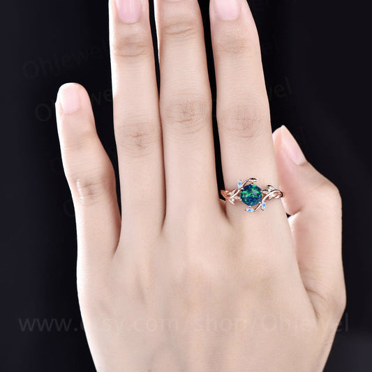 Vintage Hexagon black opal engagement ring art deco nature inspired moonstone ring women leaf rose gold branch promise wedding ring gift