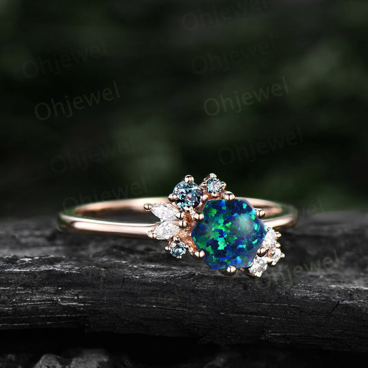 Hexagon black opal ring gold silver for women vintage unique opal engagement ring cluster alexandrite art deco diamond bridal ring gifts