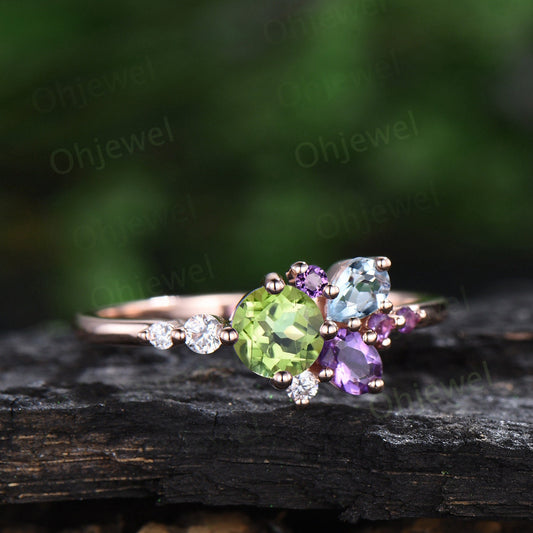 Round peridot ring Personalized cluster amethyst ring vintage pear aquamarine ring dainty multi stone ring unique engagement ring women gift