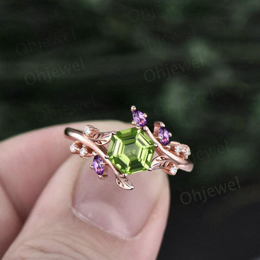 Hexagon peridot ring vintage marquise amethyst ring rose gold leaf nature inspired engagement ring women diamond bridal promise ring her