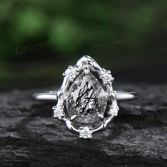 Pear black rutilated quartz ring vintage halo leaf branch nature inspired engagement ring white gold Twisted diamond anniversary ring women