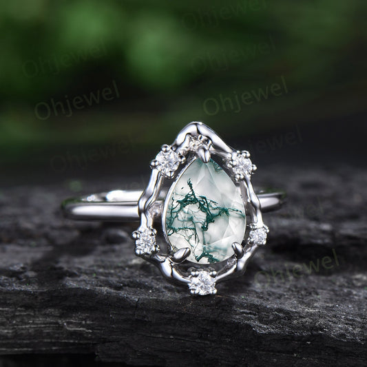 Vintage pear moss agate engagement ring leaf Nature inspired halo cluster diamond ring women 14k white gold branch antique wedding ring gift