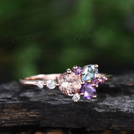 Round natural morganite ring rose gold vintage cluster amethyst ring pear aquamarine ring vintage dainty unique engagement ring women gift