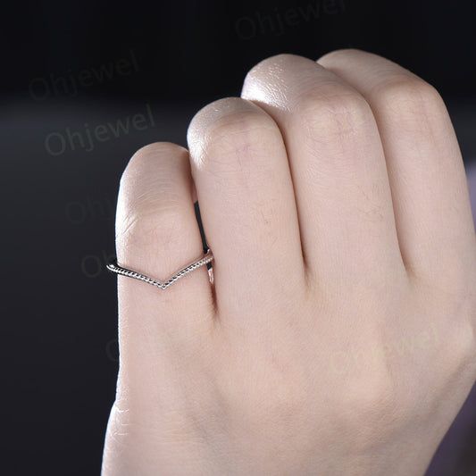 Curved V shaped solitaire wedding band solid 14k white gold Milgrain art deco stacking matching wedding ring band women 925 sterling silver