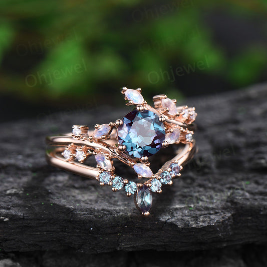 1ct round alexandrite engagement ring leaf cluster rose gold marquise moonstone ring women stacking twisted promise anniversary ring set