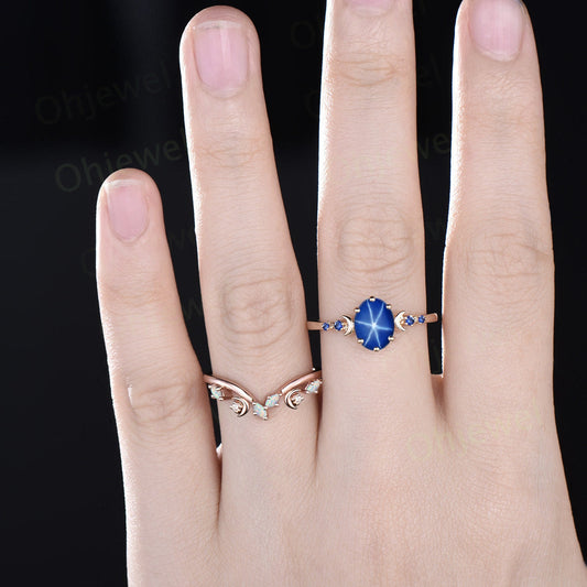 Oval star sapphire ring moon opal wedding ring set art deco five stone unique engagement ring women yellow gold anniversary ring gift