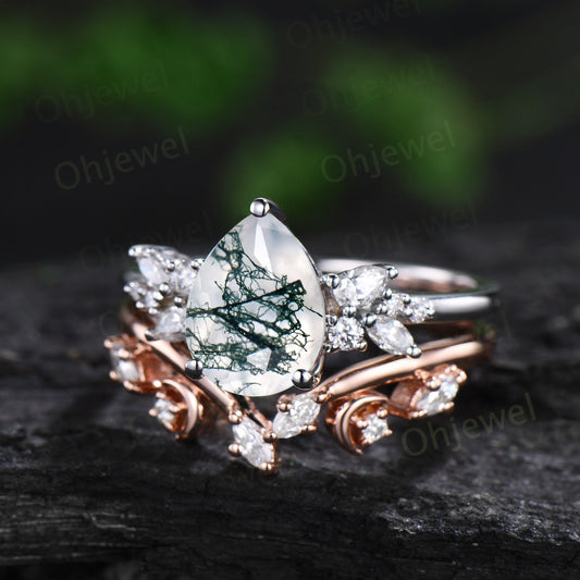 Pear moss agate engagement ring 14k white gold cluster snowdrift diamond ring vintage moon unique bridal wedding ring band set women gift
