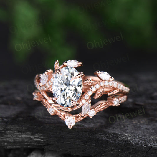 Unique oval cut moissanite engagement ring rose gold vintage cluster leaf half eternity twisted diamond wedding bridal ring set women gift