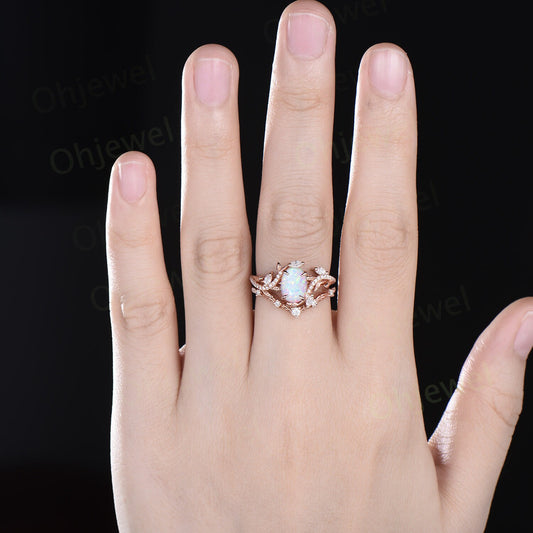 Oval white opal ring vintage rose gold leaf nature inspired unique engagement ring half eternity diamond anniversary ring set gift for women