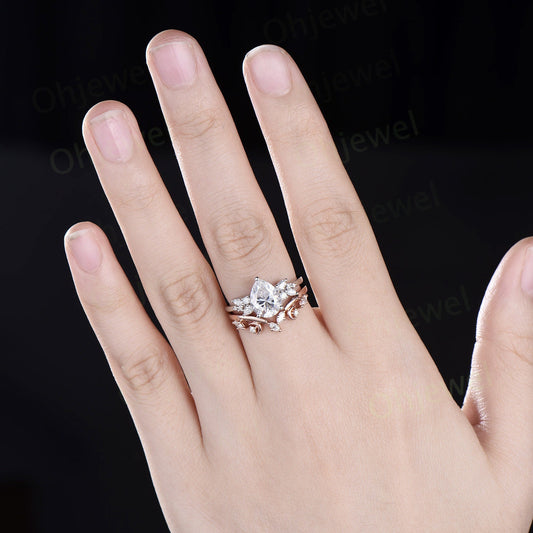 Pear moissanite engagement ring 14k white gold cluster snowdrift diamond ring vintage moon unique bridal wedding ring band set women