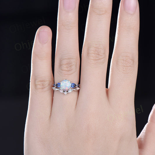 Round opal ring vintage five stone white gold unique engagement ring women pear sapphire ring 6 prong anniversary ring set gift jewelry