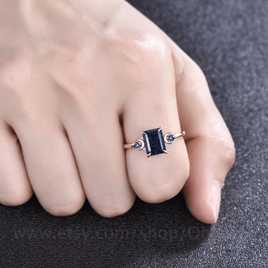 Vintage emerald cut blue sandstone ring unique engagement ring rose gold moon ring cluster sapphire ring dainty anniversary ring for women