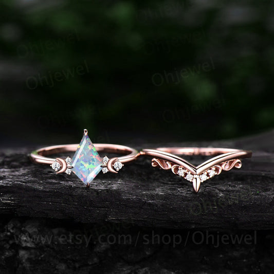 Opal ring vintage kite cut white opal engagement ring set rose gold moon ring set cluster diamond ring unique anniversary ring women gift