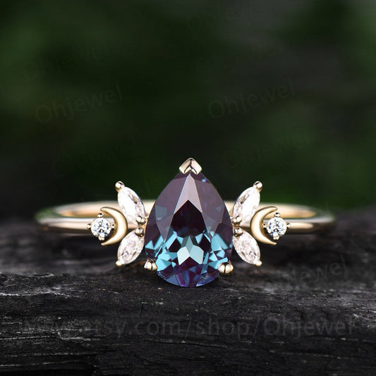 Unique pear shaped alexandrite engagement ring rose gold moon ring vintage art deco amethyst ring women moissnaite promise wedding ring gift