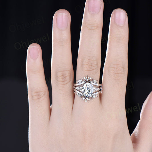 4ct oval cut moissanite engagement ring set solid 14k white gold art deco diamond ring vintage moon Celtic knot wedding ring set for women