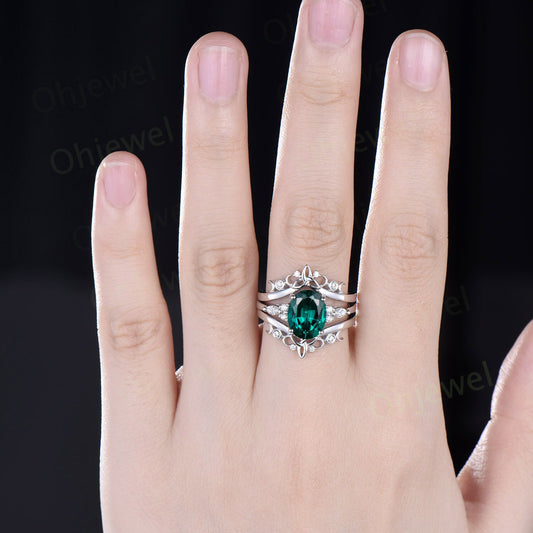 8x10mm oval cut Emerald engagement ring set solid 14k white gold Celtic knot diamond ring vintage fine jewelry stacking bridal set women