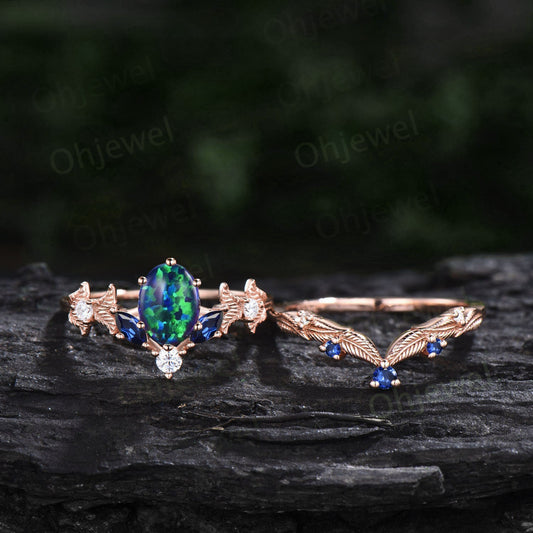 Vintage oval black opal engagement ring set rose gold twig marquise cut sapphire ring branch leaf moissanite wedding bridal ring set women