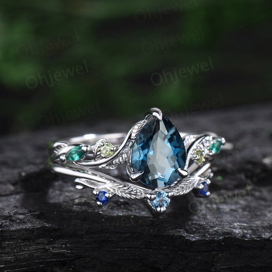 Pear shaped London blue topaz ring vintage art deco sapphire peridot emerald ring white gold twig nature inspired engagement ring women gift