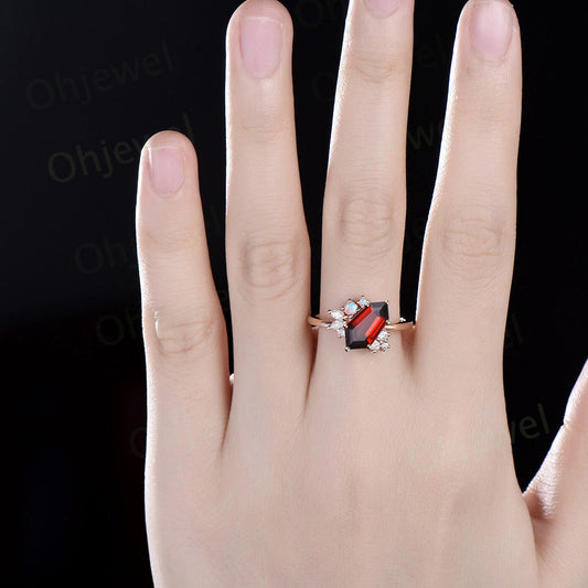 Vintage Hexagon cut red garnet ring engagement ring art deco cluster opal ring rose gold silver 6 prong set marquise diamond ring for women