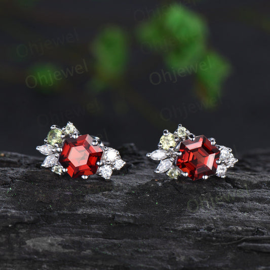 Hexagon cut red garnet earrings solid 14k 18k white gold cluster peridot moissanite stud earrings women wedding anniversary gift