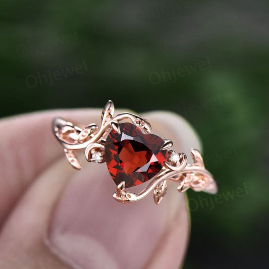 Hexagon cut red garnet ring vintage rose gold leaf moon unique engagement ring women twig Nature inspired diamond anniversary ring gift