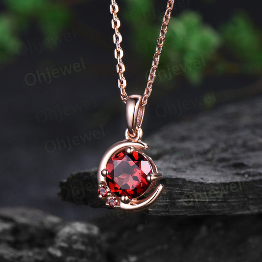 Vintage round cut red garnet necklace 14k rose gold Personalized dainty moon three stone unique Pendant women birthday anniversary gift