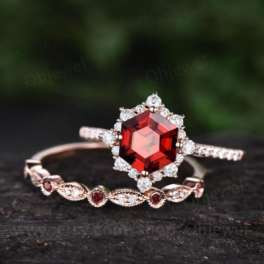 Hexagon cut red garnet engagement ring set half eternity snowdrift halo diamond ring women milgrain alexandrite wedding ring set gift