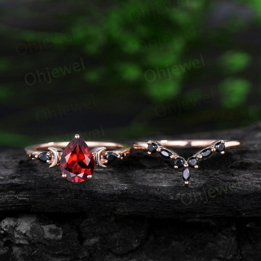 Pear shaped red garnet engagement ring set 14k rose gold marquise black spinel moon five stone stacking wedding ring set women gemstone