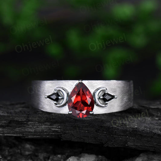 Pear garnet mens wedding band three stone moon kite black spinel mens wedding ring solid 14k white gold anniversary gift for husband