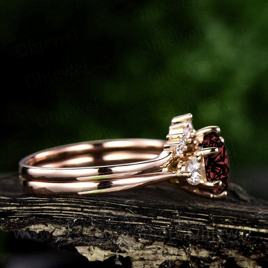 Rose gold ring set unique vintage engagement ring 2pcs pear garnet engagement ring set cluster moissanite ring set garnet wedding bridal set