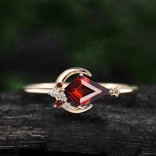 Kite cut garnet ring vintage cluster diamond ring rose gold east to west moon star engagement ring gemstone unique wedding ring women