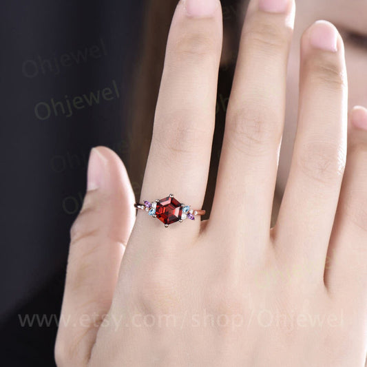 Hexagon cut red garnet engagement ring solid 14k rose gold 6 prong cluster snowdrift amethyst topaz ring vintage anniversary ring women