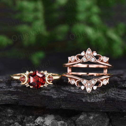 Vintage hexagon cut red garnet engagement ring solid 14k yellow gold moon celtic knot unique bridal wedding ring set women gemstone gift