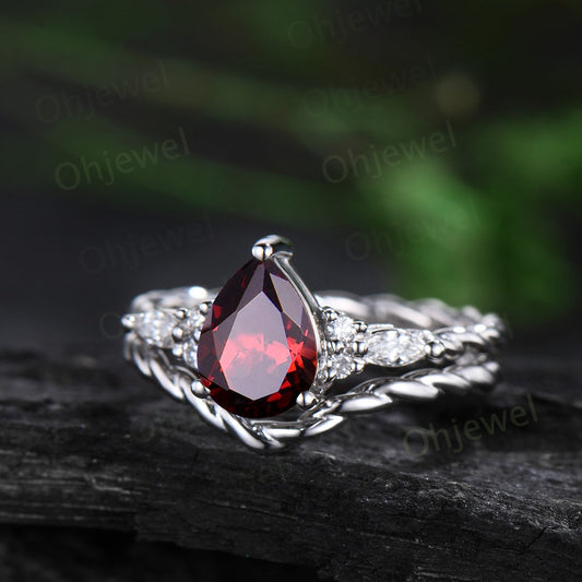 Vintage pear red garnet ring white gold twisted unique engagement ring moisanite stacking anniversary wedding bridal ring set women gift