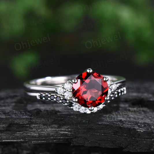 Round cut red garnet ring white gold black diamond ring 6 prong unique engagement ring women gemstone stacking wedding bridal ring set