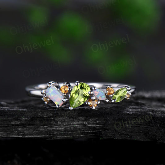 Cluster pear peridot ring art deco Baguette opal ring dainty citrine ring women solid 14k white gold anniversary wedding ring band gift