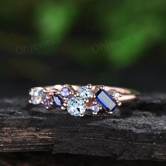 Round Aquamarine ring vintage rose gold Baguette sapphire ring dainty tanzanite ring unique wedding ring band women gift for her silver