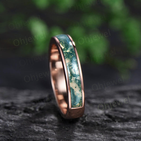 Half eternity bezel natural moss agate wedding band mens stacking ring 14k rose gold unique engagement bridal ring for husband him silver