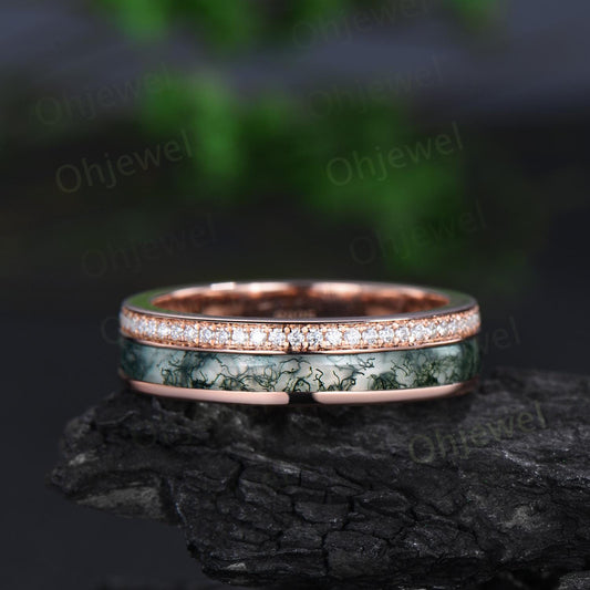 Full eternity bezel moss agate wedding band mens double line moissanite rose gold ring unique engagement bridal ring for husband him silver